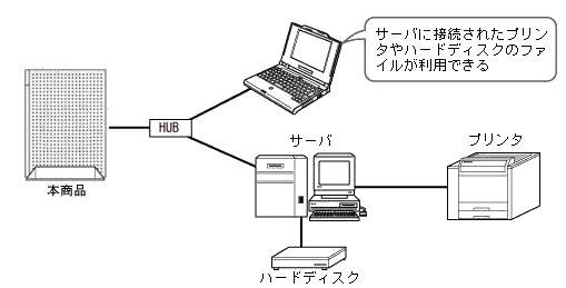 | 本商品にHUBを介して接続されたパソコンどうしで、ファイルのやりとりをしたり、他のパソコンに接続されているプリンタを利用することができます。 ここでは、設定の一例を参考にして、説明を行います。 下記で説明するサーバとは、ファイルを置くパソコンのことを指し、クライアントとは、サーバに接続されたプリンタやハードディスクのファイルが利用できるパソコンを指します。 |