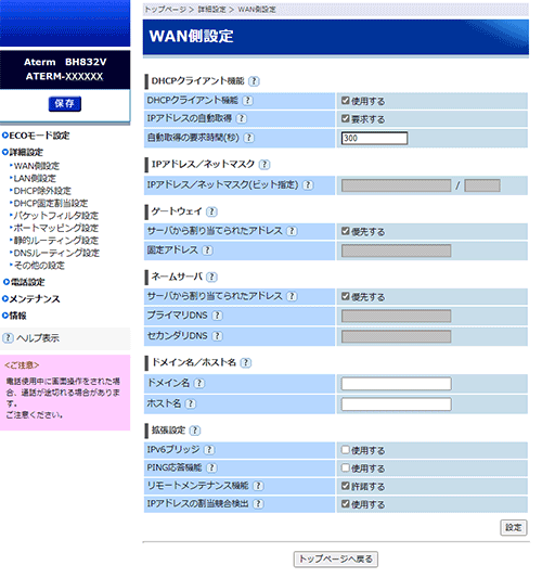 本商品のWAN側をDHCPクライアントとして使用する場合は、チェックします。 |