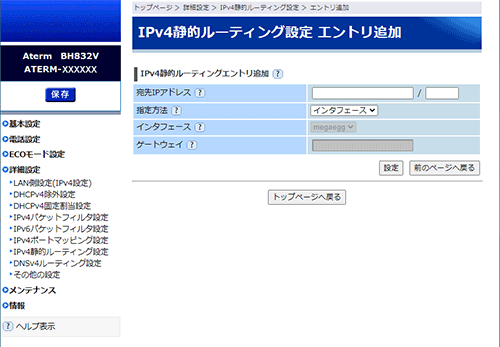 [追加]をクリックすると[IPv4静的ルーティング設定 エントリ追加]に進みます。 |
