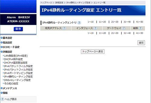 本商品では、[IPv4静的ルーティングエントリ]のパターンを最大50個設定できます。