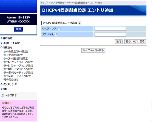 | ■DHCPv4固定割当設定 エントリ追加 |
