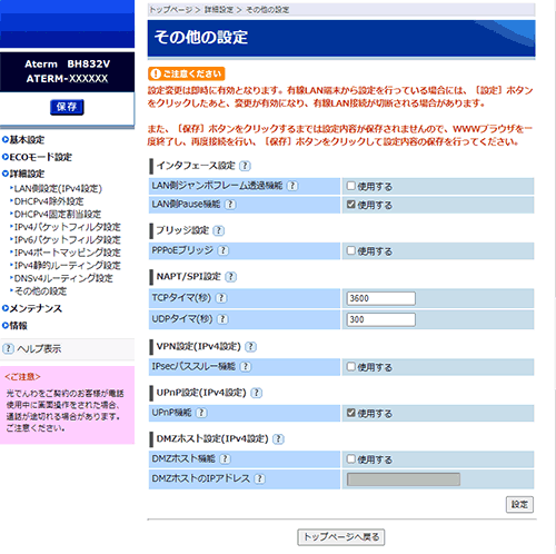 NAPT/SPI機能を使用する際のIPアドレス/ポート番号の動的変換テーブルの有効保持時間(秒)を入力します。NAPTテーブルが枯渇して通信ができなくなるアプリケーションを利用する場合は、本タイマを短めに設定すると解決できることがあります。入力できる値は、30〜3600(秒)です。(IPv4/IPv6共通) |