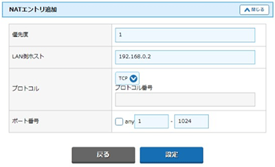 入力形式はパケットフィルタ設定の送信元ポート番号/宛先ポート番号と同様です。(この例でのポート番号の設定は、範囲指定です。)