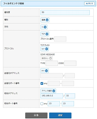 ※ 送信元ポート番号/宛先ポート番号には、パケットを拒否したいポート番号を入力してください。