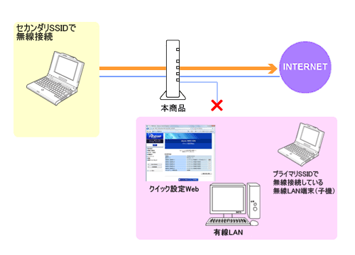 | マルチSSIDのそれぞれのネットワーク(プライマリSSID/セカンダリSSID)に接続した無線LAN端末(子機)や、有線で接続されたパソコンへのアクセスを制限し、本商品(親機)に接続した他のネットワークから分離することができます。 なお、WAN側が分離されることはありません。 (初期値:プライマリSSIDは「使用しない」、セカンダリSSIDは「使用する」) |
