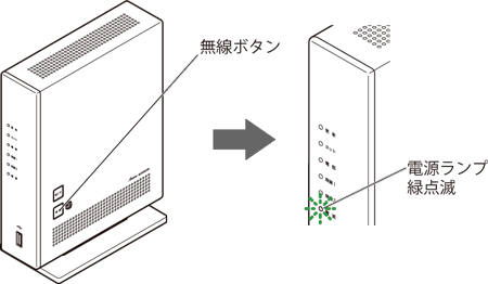 本商品(親機)の無線ボタンを長押しし、電源ランプが緑点滅になったら放す