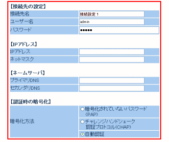 接続パスワード: ADSL接続事業者またはプロバイダから割り当てられたパスワードを 入力します。