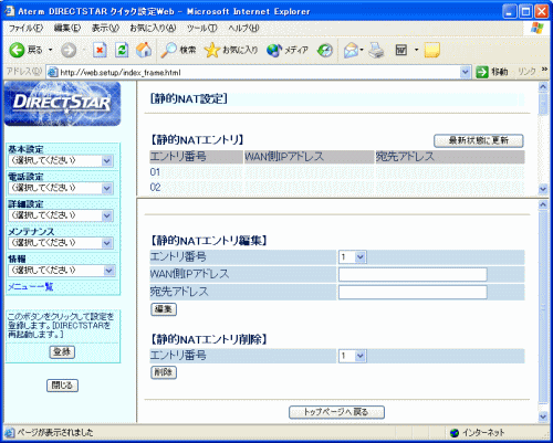 本商品では、[静的NATエントリ]のパターンを最大20個設定できます。