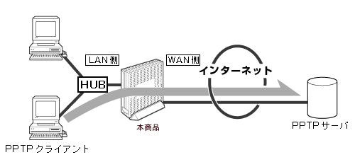 | <利用例1> 本商品に接続したPPTPクライアントからPPTPサーバに接続する ![]() | |