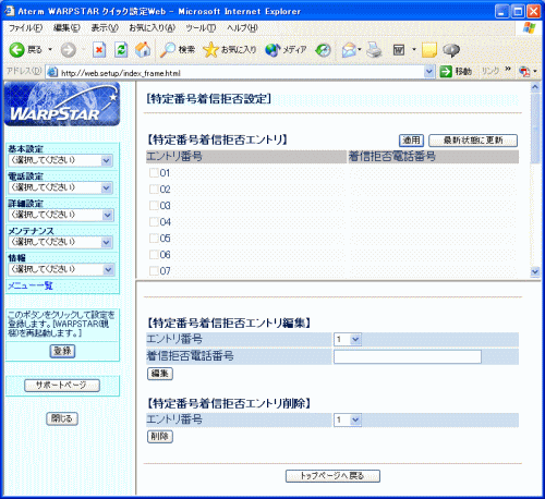 着信拒否の指定を外す電話番号の「エントリ番号」のチェックボックスの