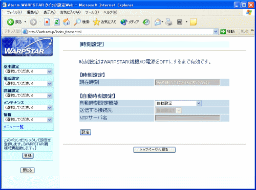 「自動時刻設定機能」で、「自動設定」または「NTPサーバ名を指定する」で時刻設定を行う場合には、あらかじめ本商品を回線に接続しておいてください。