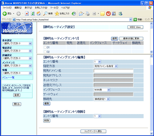 【静的ルーティングエントリを編集する場合は、下記の■静的ルーティングエントリ編集を 参照してください】 |