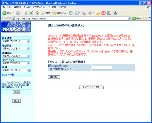 新5.2GHz帯(W52)書き換え用パスワードを入力します。