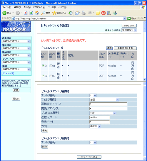 LAN側またはWAN側のどちらで使用するか「エントリ番号」のチェックボックスをチェックする |