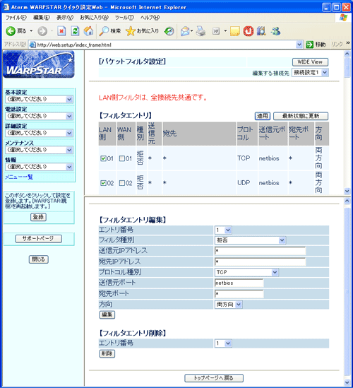LAN側またはWAN側のどちらで使用するか「エントリ番号」のチェックボックスをチェックする |
