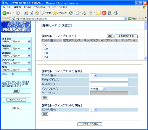 【静的ルーティングエントリを編集する場合は、下記の■静的ルーティングエントリ編集を 参照してください】 |