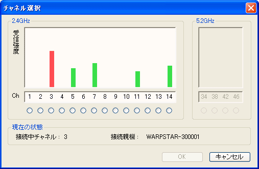 現在接続中のチャネル、無線LANアクセスポイント(親機)のネットワーク名(SSID)が表示されます。 ※赤色は自チャネルを示します。 |