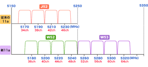 IEEE802.11aのチャネルには、2005年5月以前の従来チャネル(J52)と、2005年5月以降の新チャネル(W52・W53)があります。