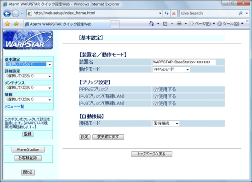 動作モード (初期値:「らくらくWebウィザード」で選択した「設定パターン」によって変わります。)