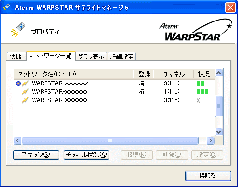 する場合、サテライトマネージャの[ネットワーク一覧]のチャネル表示が[状態]の表示と