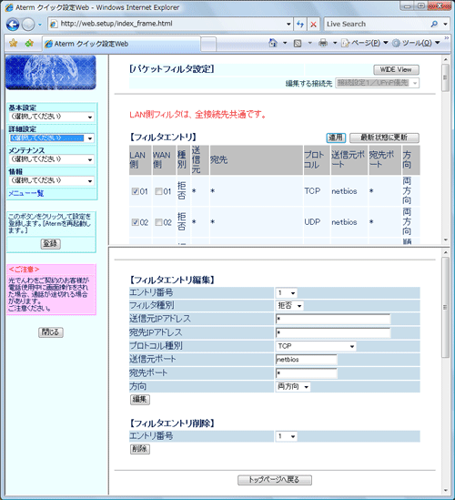 - 「パケットフィルタ設定」の[編集][削除][[適用]ボタンをクリックしたとき、通話やデータ通信が途切れる場合があります。