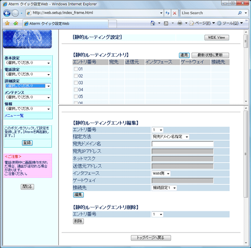 - 「静的ルーティング設定」の[編集][削除][適用]ボタンをクリックしたとき、通話やデータ通信が途切れる場合があります。