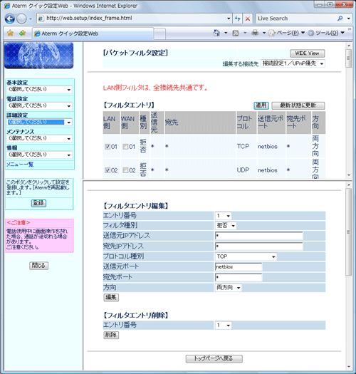 - 「パケットフィルタ設定」の[編集][削除][[適用]ボタンをクリックしたとき、通話やデータ通信が途切れる場合があります。