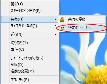 共有したいフォルダを右クリックし、「共有」-「特定のユーザー...」 をクリックする |