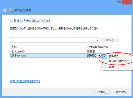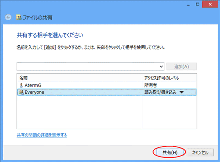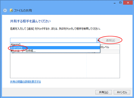 「共有する相手を選んでください」のプルダウンメニューから「Everyone」を選択し、[追加]をクリックする |