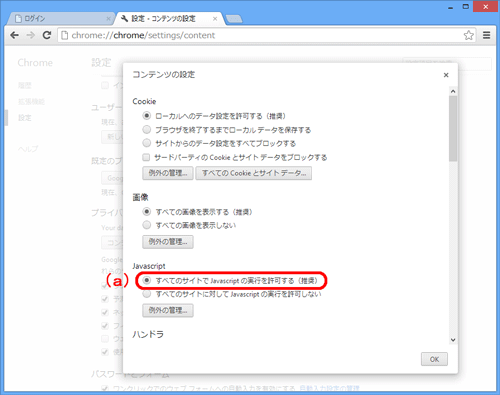 「Javascript」で「すべてのサイトでJavascript の実行を許可する(推奨)」を選択する(<図1>の(a))