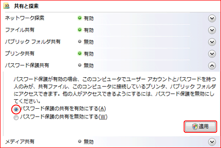 「パスワード保護の共有を有効にする」を選択し、[適用]をクリックする