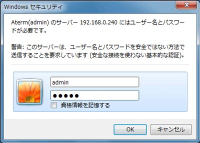 ユーザー名には「admin」と入力し、パスワードには手順3で入力した管理者パスワードを入力し、