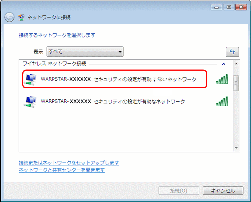 本商品(親機)のネットワーク名(SSID)を選択し[接続]をクリックします。 |