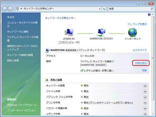 本商品(親機)のネットワーク名(SSID)が表示されない場合は、[ネットワークと共有センター]の「タスク」欄の[接続またはネットワーク名のセットアップ]をクリックして、こちらへ進みます。 |