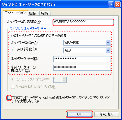 「ワイヤレス ネットワークのプロパティ」のアソシエーションタブで「ネットワーク名(SSID)」、「ワイヤレス ネットワークキー」を入力して[OK]をクリックする |