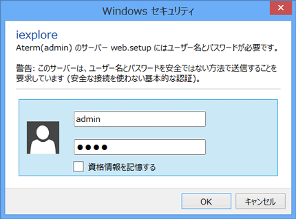 ユーザー名(上段)に「admin」を、パスワード(下段)に5-aで入力した「管理者パスワード」を入力し、[OK]をクリックする |