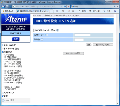 DHCP除外設定は、「詳細設定」-「LAN側設定」で、「DHCPサーバ機能」が「使用する」で「アドレス割当パターン」が「手動設定」の場合に設定できます。