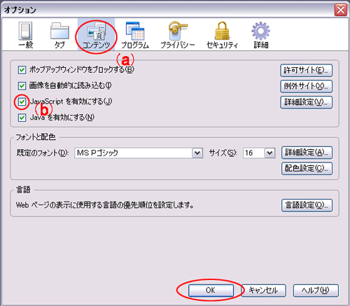 [JavaScriptを有効にする]にチェックする(<図1>の(b))
