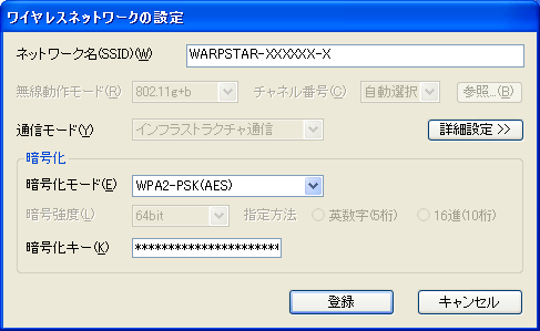 WPA-PSK(TKIP)/WPA-PSK(AES)/WPA2-PSK(TKIP)/WPA2-PSK(AES)使用時は8〜63桁の英数記号または64桁の16進数を入力します。