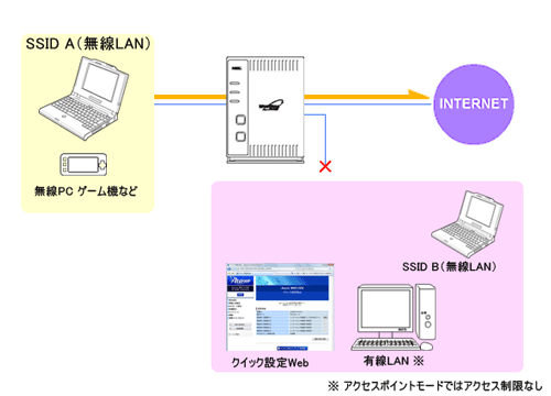 ※インターネットや同一のSSID側の無線LAN端末とのみ通信可能です。 |