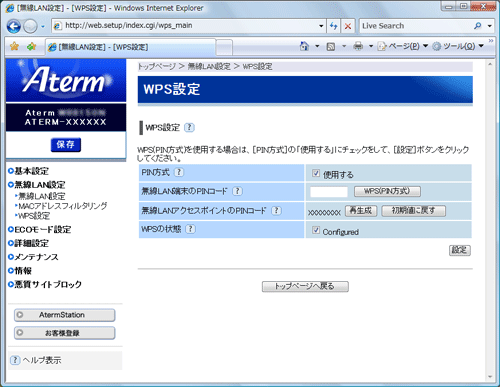 • 「WPSの状態」の「Configured」の設定を外した場合、予期せず無線LAN設定が上書きされる場合があります。セキュリティの観点から、「Configured」に設定をすることをお勧めします。