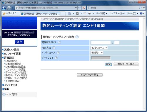 静的ルーティングによってルーティング先になるネクストホップルータ(ゲートウェイ)のIPアドレスを入力します。 |