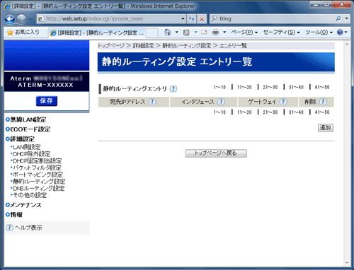 - 静的ルーティングエントリは、[静的ルーティングエントリ]の表の上にあるものが最優先されます。