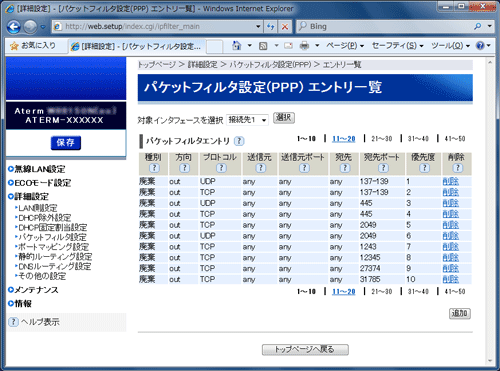 | ■パケットフィルタ設定(PPP) エントリ一覧 |