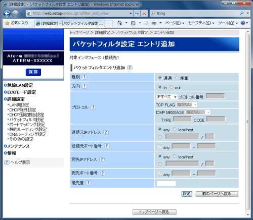 | ■パケットフィルタ設定 エントリ追加 |