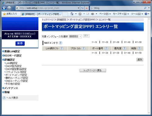 | ■ポートマッピング設定(PPP) エントリ一覧 |