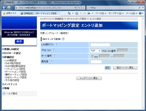 | ※画面の[追加]をクリックすると[ポートマッピング エントリ追加]画面に進みます。 |