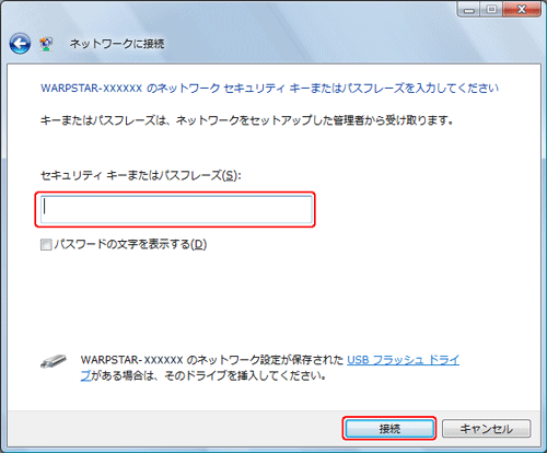 「セキュリティ キーまたはパスフレーズ」に本商品に設定されている暗号化キーを入力し[接続]をクリックします。 |