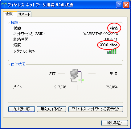 (画面はWL300NU-GのIEEE802.11n通信時で、デュアルチャネル(※)を「使用する」に設定している場合です。※デュアルチャネルについての詳細はこちら) |