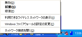 Windows(R) XPの通知領域にある[ワイヤレス ネットワーク接続]アイコンを右クリックし、「利用できるワイヤレスネットワークの表示」をクリックします。 |